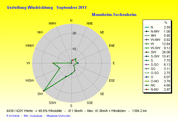 Die Durchschnittstemperatur für den Monat September 2011 lag bei 17.67°C. Die Abweichung vom langjährigen Mittel war +2.37°C.