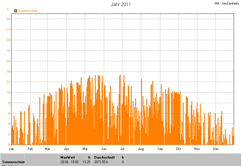 Dargestellt wird die grafische Übersicht für die Sonnenscheinzeit. Zu sehen sind immer die täglichen Zeiten (von 0-24 Uhr):