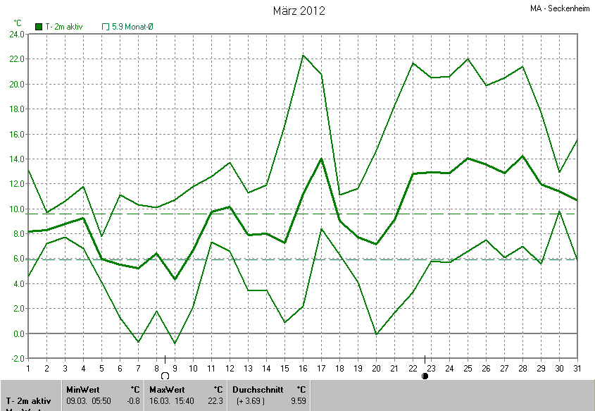 Die Durchschnittstemperatur für den Monat März 2012 lag bei 9.59°C. Die Abweichung vom langjährigen Mittel war +3.69°C.