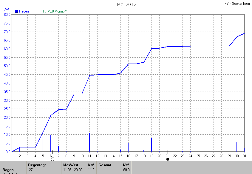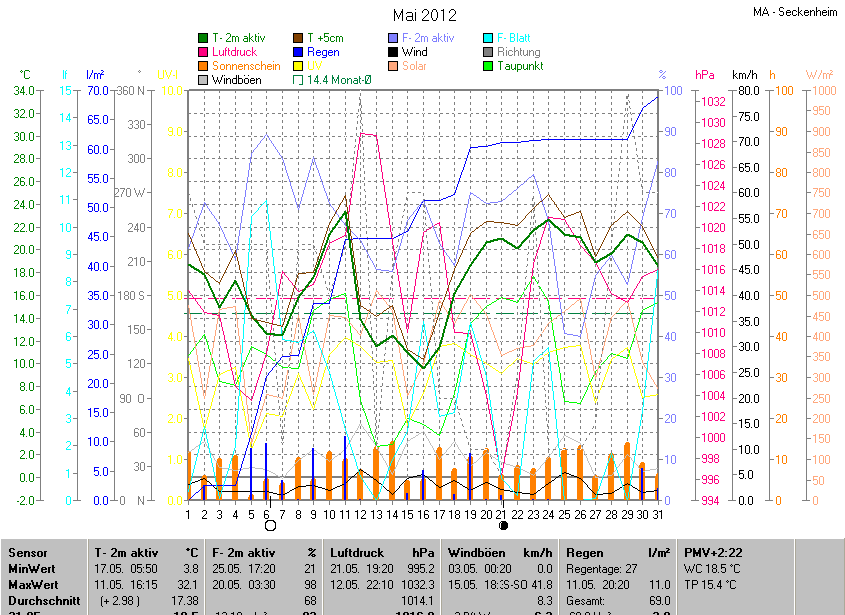 Der wärmste Tag war der 11.05.2012 um 16:15 mit 32.1°C. Am kältesten war es mit 3.8°C am 17.05.2012 um 05:50.