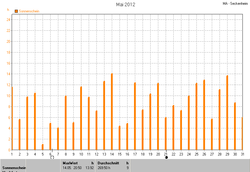 Dargestellt wird die grafische Übersicht für die Sonnenscheinzeit. Zu sehen sind immer die täglichen Sonnenstunden (von 0-24 Uhr):