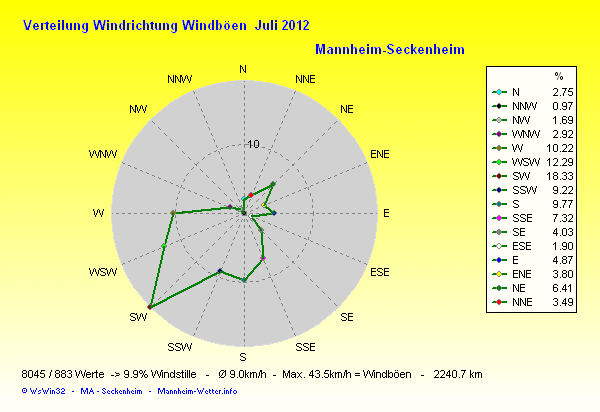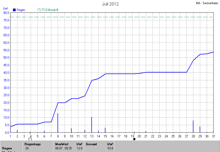 Die Durchschnittstemperatur für den Monat Juli 2012 lag bei 20.25°C. Die Abweichung vom langjährigen Mittel war +0.75°C.