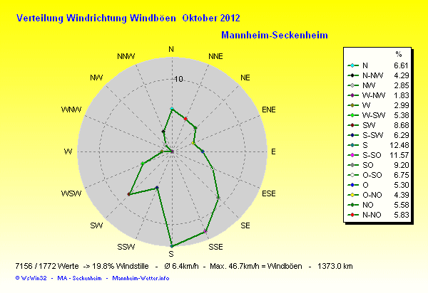 Die Durchschnittstemperatur für den Monat Oktober 2012 lag bei 10.38°C. Die Abweichung vom langjährigen Mittel war -0.02°C.
