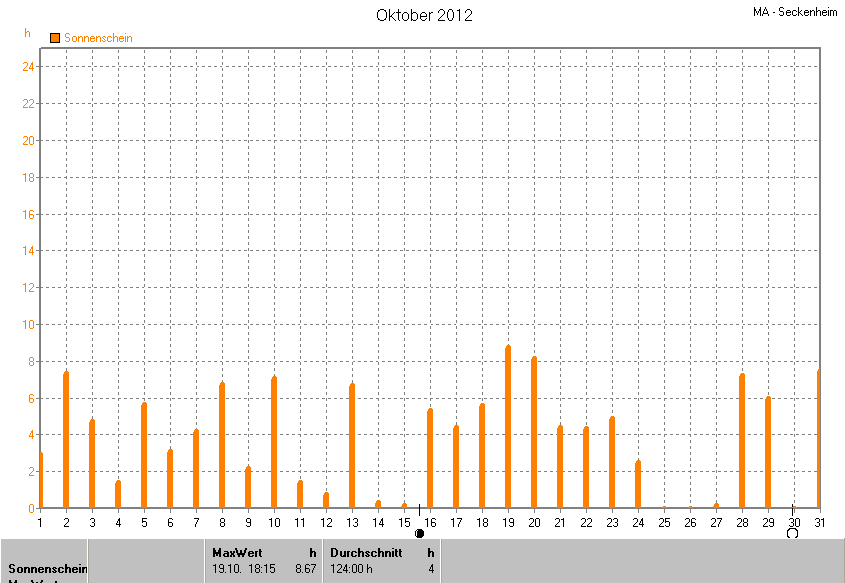 Dargestellt wird die grafische Übersicht für die Sonnenscheinzeit. Zu sehen sind immer die täglichen Sonnenstunden (von 0-24 Uhr):