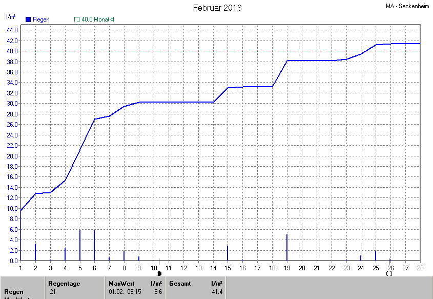 Die gesamte Regenmenge lag bei 41.4l/m² (entspricht: 103.5%) und war damit um +1.4l/m² vom langjährigen Wert entfernt. Niederschlag gab es an 16Tagen. Mehr als 2mm Regen gab es an 7Tagen. Sehr viel Regen mit mehr als 20mm pro Tag gab es an 0Tagen.