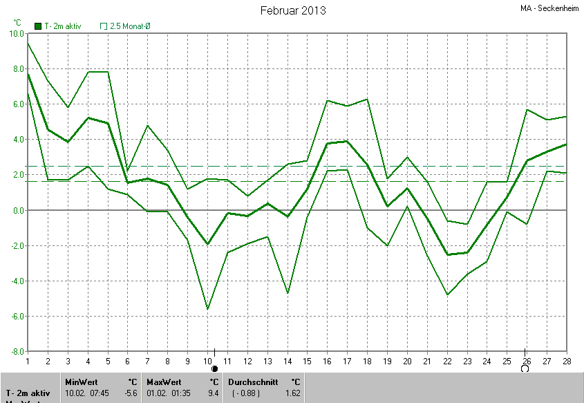 Die Durchschnittstemperatur für den Monat Februar 2013 lag bei 1.62°C. Die Abweichung vom langjährigen Mittel war -0.88°C.