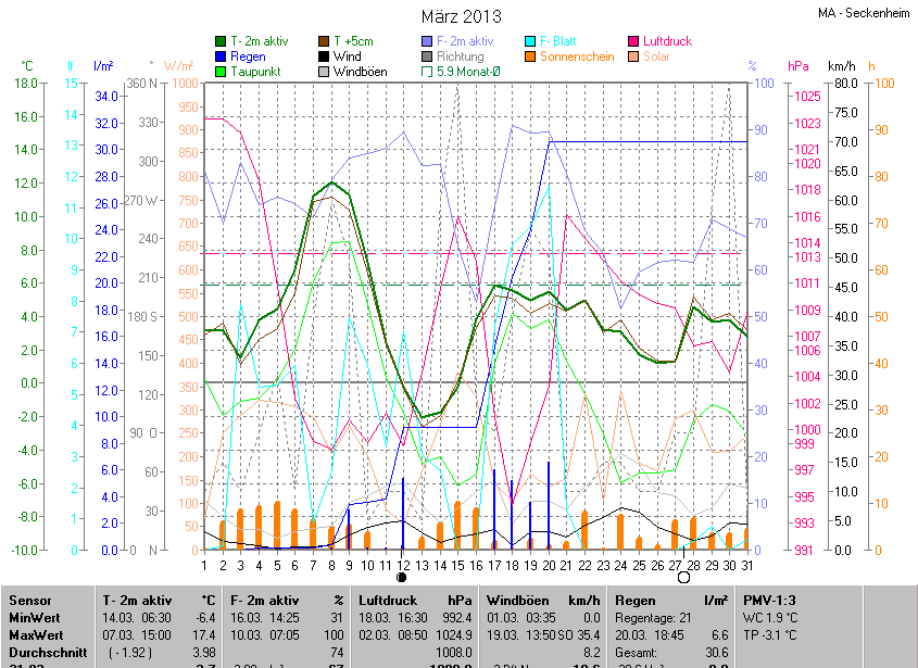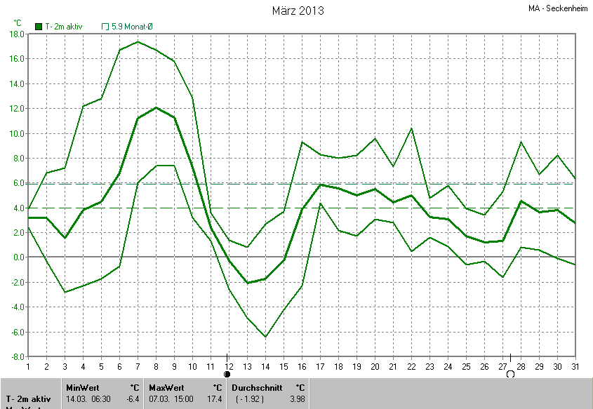 Der wärmste Tag war der 07.03.2013 um 15:00 mit 17.4°C. Am kältesten war es mit -6.4°C am 14.03.2013 um 06:30.