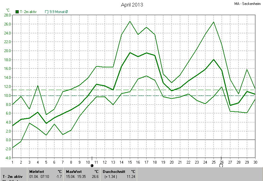 Die Durchschnittstemperatur für den Monat April 2013 lag bei 11.24°C. Die Abweichung vom langjährigen Mittel war +1.34°C.