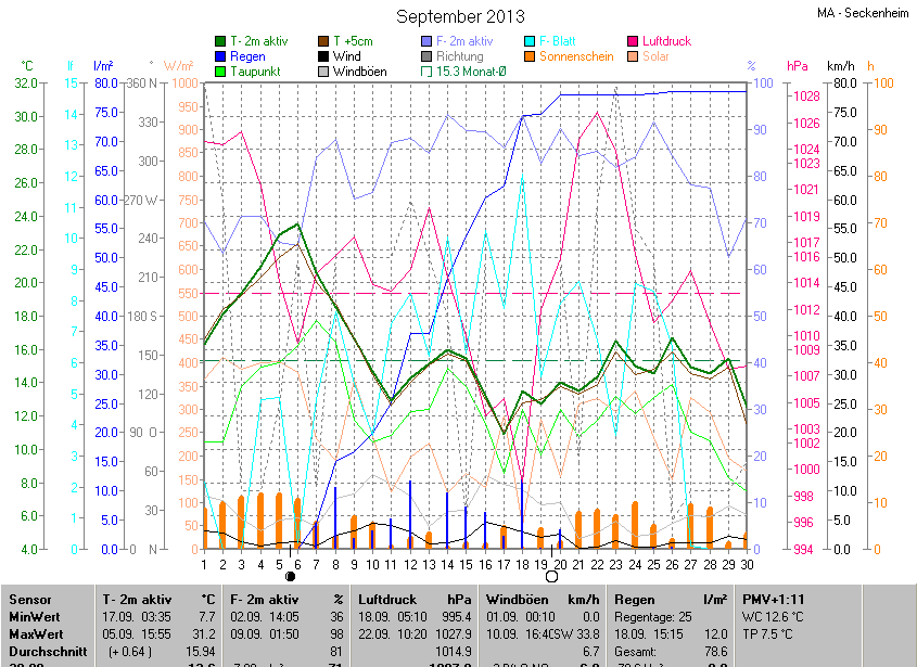 Die Durchschnittstemperatur für den Monat September 2013 lag bei 15.94°C. Die Abweichung vom langjährigen Mittel war +0.64°C.