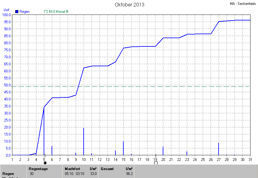 Dargestellt wird die grafische Übersicht für den Niederschlag. Zu sehen sind immer die täglichen Niederschlagsmengen (von 0-24 Uhr) und in der ansteigenden Linie die Summe aller Niederschläge: