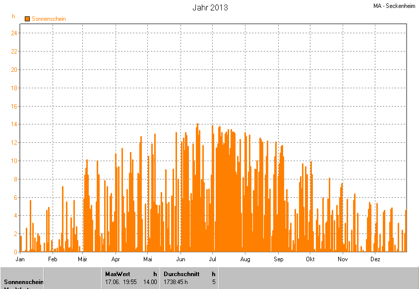 Dargestellt wird die grafische Übersicht für die Sonnenscheinzeit. Zu sehen sind immer die täglichen Zeiten (von 0-24 Uhr):