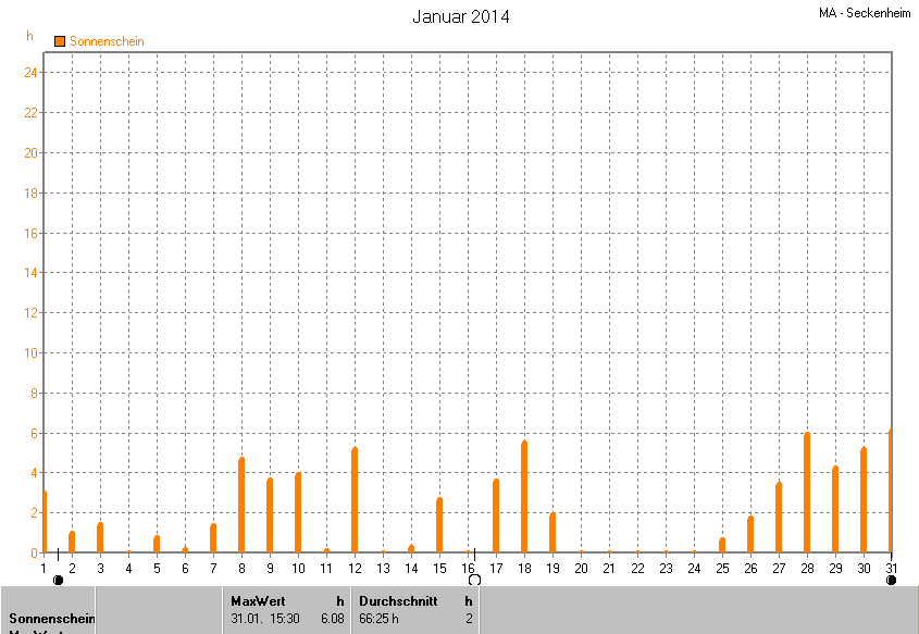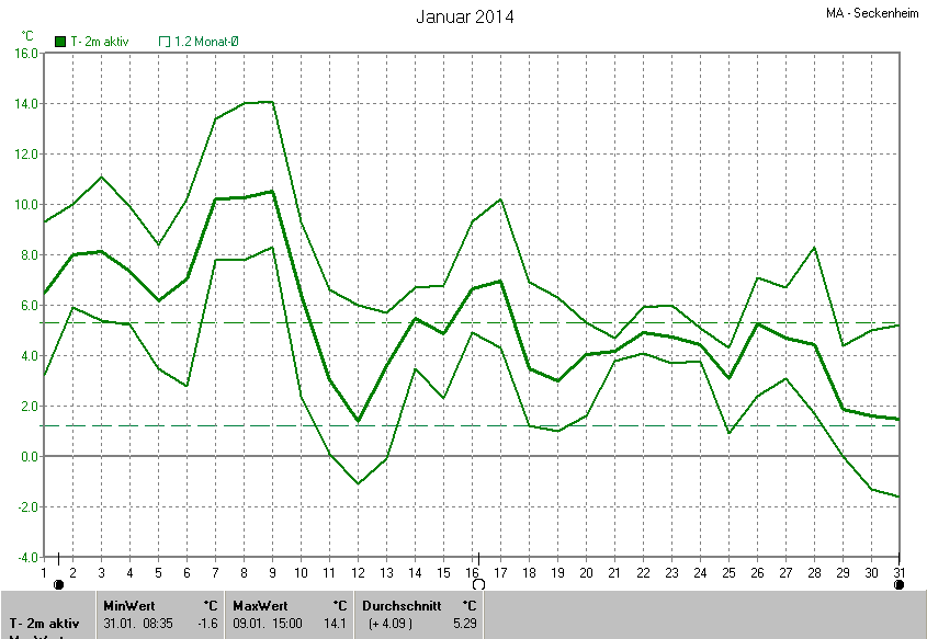 Der wärmste Tag war der 09.01.2014 um 15:00 mit 14.1°C. Am kältesten war es mit -1.6°C am 31.01.2014 um 08:35.