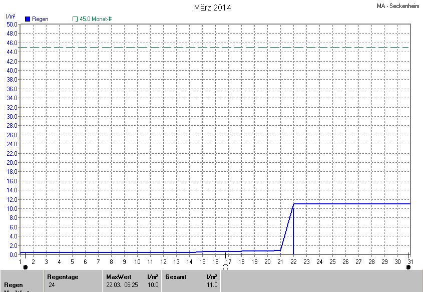 Die gesamte Regenmenge lag bei 11.0l/m² (entspricht: 24.4%) und war damit um -34.0l/m² vom langjährigen Wert entfernt. Niederschlag gab es an 5Tagen. Mehr als 2mm Regen gab es an 1Tagen. Sehr viel Regen mit mehr als 20mm pro Tag gab es an 0Tagen.