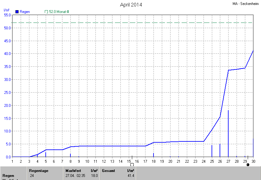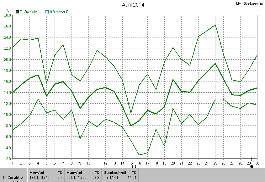 Der wärmste Tag war der 25.04.2014 um 15:20 mit 26.3°C. Am kältesten war es mit 2.7°C am 16.04.2014 um 05:45.