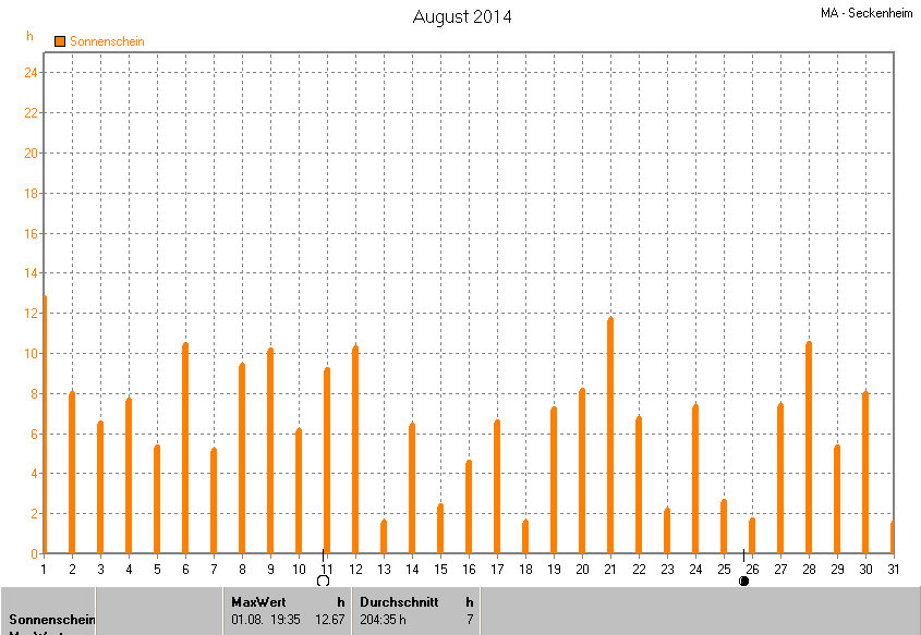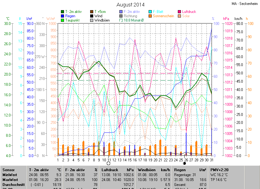 Der wärmste Tag war der 01.08.2014 um 16:20 mit 28.3°C. Am kältesten war es mit 9.3°C am 24.08.2014 um 06:55.