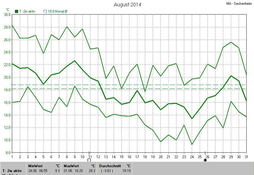 Die Durchschnittstemperatur für den Monat August 2014 lag bei 18.19°C. Die Abweichung vom langjährigen Mittel war -0.61°C.