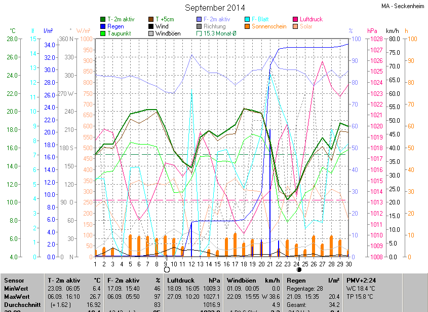 Der wärmste Tag war der 06.09.2014 um 16:10 mit 26.7°C. Am kältesten war es mit 6.4°C am 23.09.2014 um 06:05.