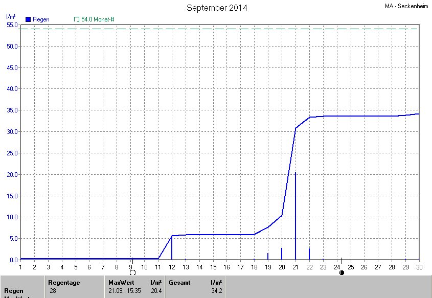Die gesamte Regenmenge lag bei 34.2l/m² (entspricht: 63.3%) und war damit um -19.8l/m² vom langjährigen Wert entfernt. Niederschlag gab es an 11Tagen. Mehr als 2mm Regen gab es an 4Tagen. Sehr viel Regen mit mehr als 20mm pro Tag gab es an 1Tagen.