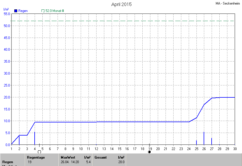 Die gesamte Regenmenge lag bei 20.0l/m² (entspricht: 38.5%) und war damit um -32.0l/m² vom langjährigen Wert entfernt. Niederschlag gab es an 9Tagen. Mehr als 2mm Regen gab es an 4Tagen. Sehr viel Regen mit mehr als 20mm pro Tag gab es an 0Tagen.