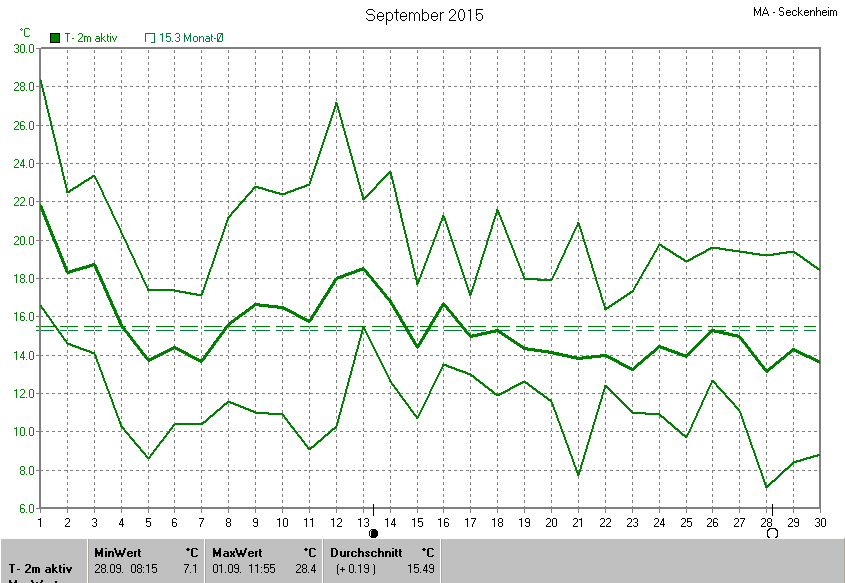 Der wärmste Tag war der 01.09.2015 um 11:55 mit 28.4°C. Am kältesten war es mit 7.1°C am 28.09.2015 um 08:15.