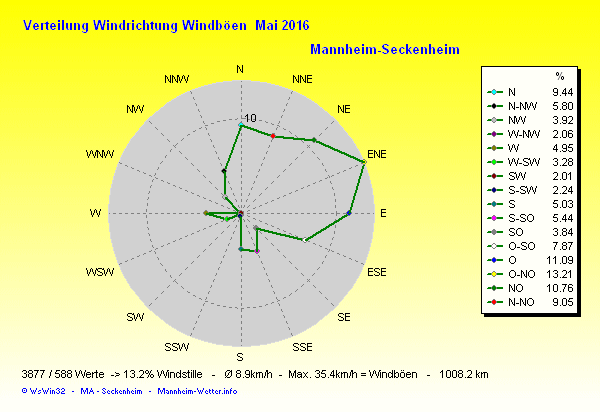 Die Durchschnittstemperatur für den Monat Mai 2016 lag bei 16.13°C. Die Abweichung vom langjährigen Mittel war +1.73°C.