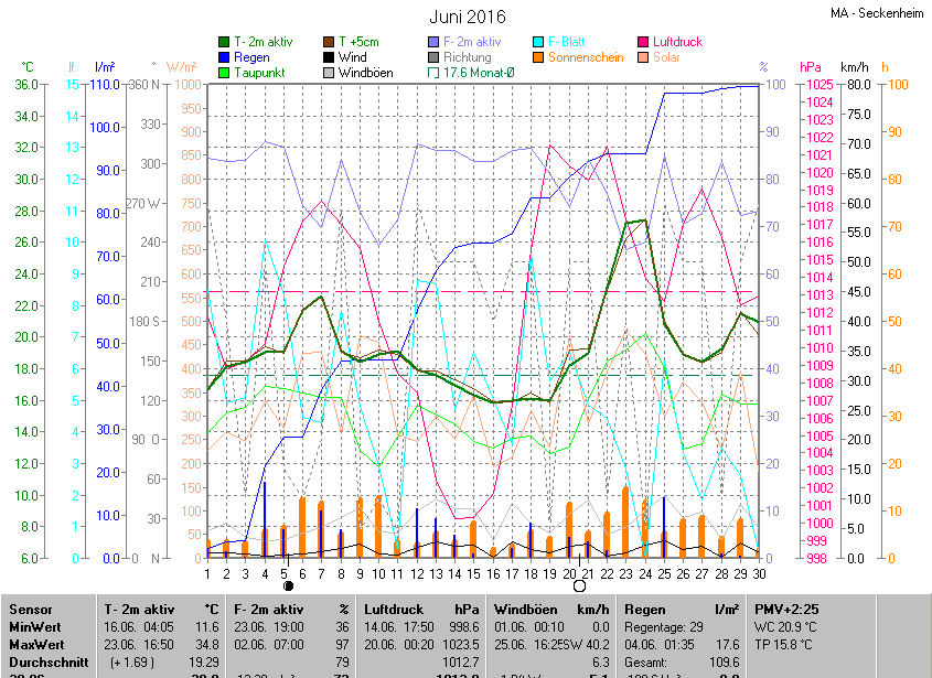 Die Durchschnittstemperatur für den Monat Juni 2016 lag bei 19.29°C. Die Abweichung vom langjährigen Mittel war +1.69°C.