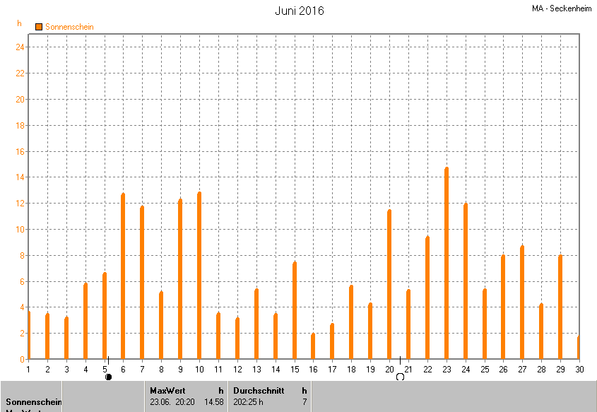 Dargestellt wird die grafische Übersicht für die Sonnenscheinzeit. Zu sehen sind immer die täglichen Sonnenstunden (von 0-24 Uhr):