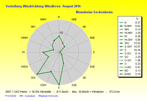 Die Durchschnittstemperatur für den Monat August 2016 lag bei 20.94°C. Die Abweichung vom langjährigen Mittel war +2.14°C.