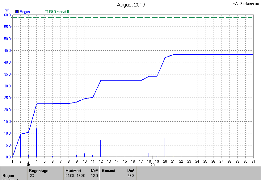 Die gesamte Regenmenge lag bei 43.2l/m² (entspricht: 73.2%) und war damit um -15.8l/m² vom langjährigen Wert entfernt. Niederschlag gab es an 12Tagen. Mehr als 2mm Regen gab es an 4Tagen. Sehr viel Regen mit mehr als 20mm pro Tag gab es an 0Tagen.