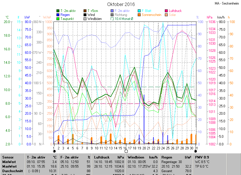 Die Durchschnittstemperatur für den Monat Oktober 2016 lag bei 10.31°C. Die Abweichung vom langjährigen Mittel war -0.09°C.