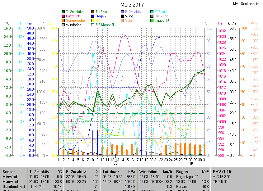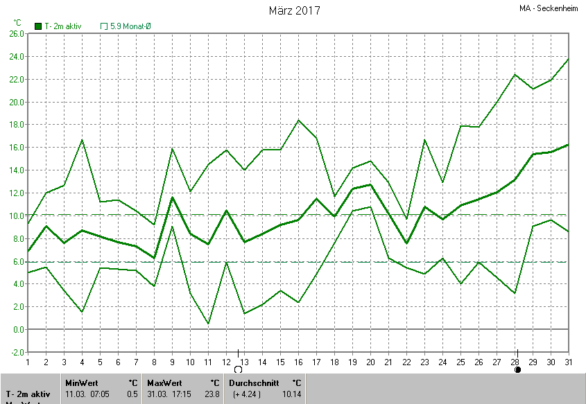 Die Durchschnittstemperatur für den Monat März 2017 lag bei 10.14°C. Die Abweichung vom langjährigen Mittel war +4.24°C.