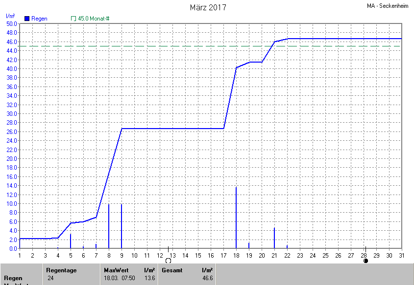 Dargestellt wird die grafische Übersicht für den Niederschlag. Zu sehen sind immer die täglichen Niederschlagsmengen (von 0-24 Uhr) und in der ansteigenden Linie die Summe aller Niederschläge: