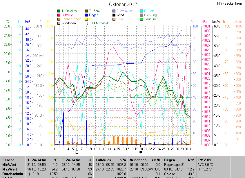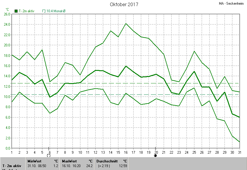 Der wärmste Tag war der 16.10.2017 um 16:20 mit 24.2°C. Am kältesten war es mit 1.2°C am 31.10.2017 um 06:50.