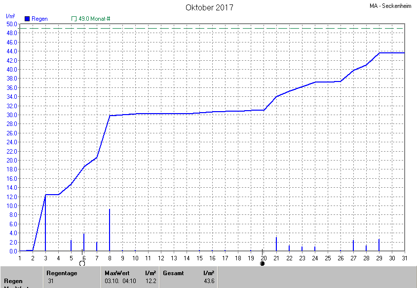 Dargestellt wird die grafische Übersicht für den Niederschlag. Zu sehen sind immer die täglichen Niederschlagsmengen (von 0-24 Uhr) und in der ansteigenden Linie die Summe aller Niederschläge: