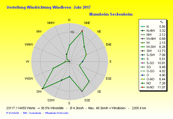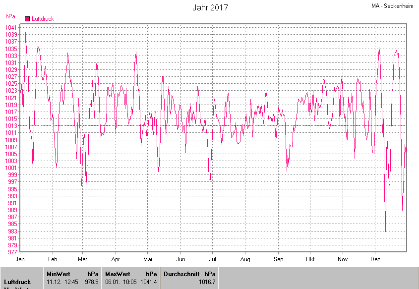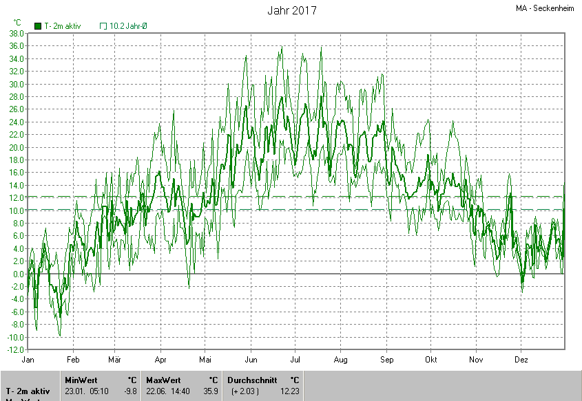 Die Durchschnittstemperatur für das Jahr 2017 lag bei 12.23°C. Die Abweichung vom langjährigen Mittel war +2.03°C.