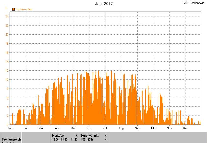 Dargestellt wird die grafische Übersicht für die Sonnenscheinzeit. Zu sehen sind immer die täglichen Zeiten (von 0-24 Uhr):