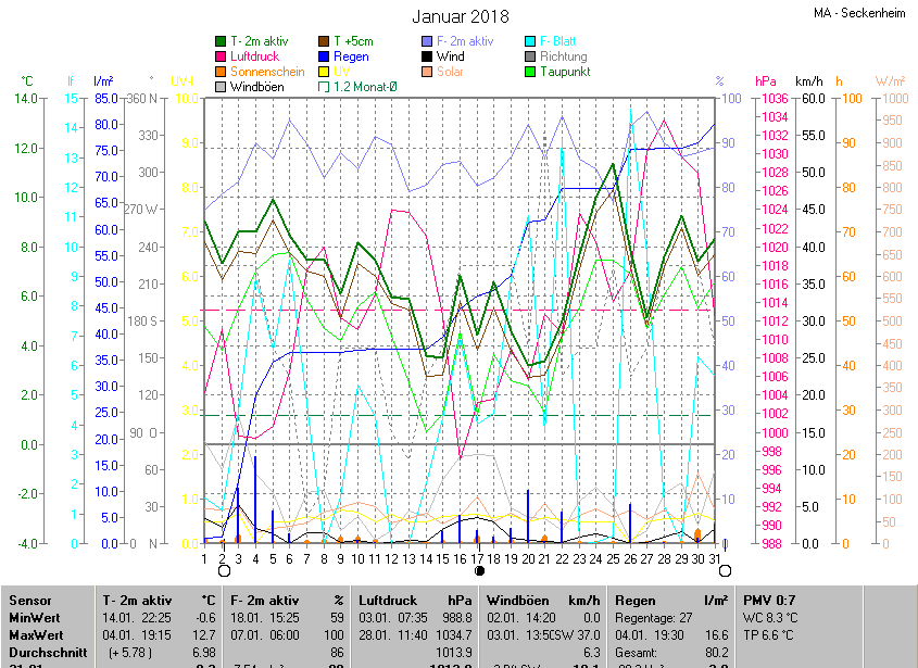Die Durchschnittstemperatur für den Monat Januar 2018 lag bei 6.98°C. Die Abweichung vom langjährigen Mittel war +5.78°C.