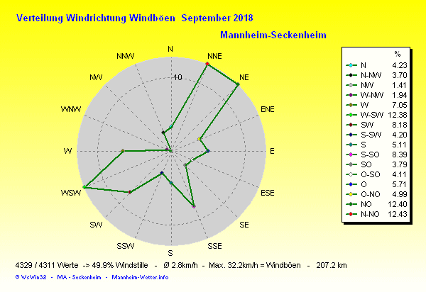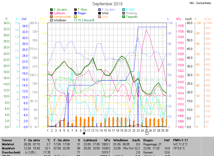 Der wärmste Tag war der 12.09.2018 um 15:45 mit 32.1°C. Am kältesten war es mit 3.7°C am 26.09.2018 um 07:15.