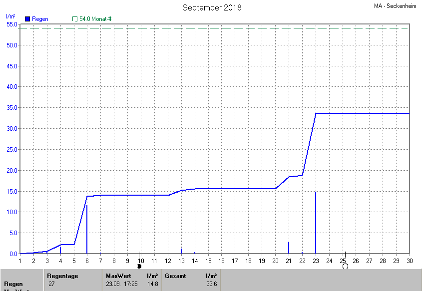 Die Durchschnittstemperatur für den Monat September 2018 lag bei 17.35°C. Die Abweichung vom langjährigen Mittel war +2.05°C.