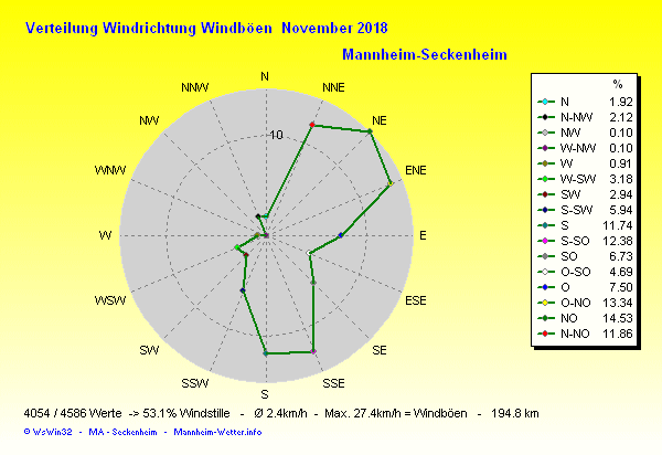 Der wärmste Tag war der 11.11.2018 um 14:05 mit 17.2°C. Am kältesten war es mit -2.1°C am 23.11.2018 um 04:55.