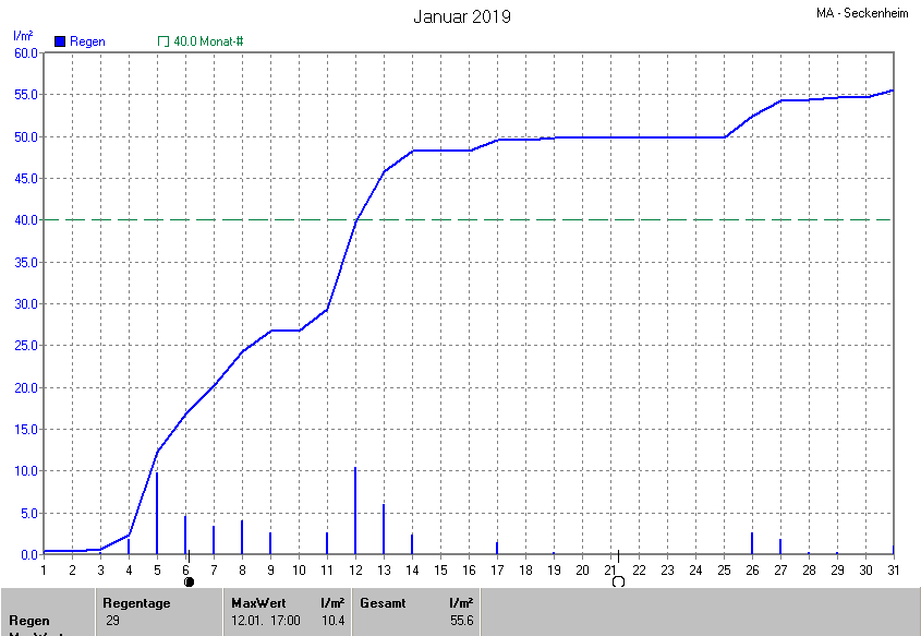 Dargestellt wird die grafische Übersicht für den Niederschlag. Zu sehen sind immer die täglichen Niederschlagsmengen (von 0-24 Uhr) und in der ansteigenden Linie die Summe aller Niederschläge: