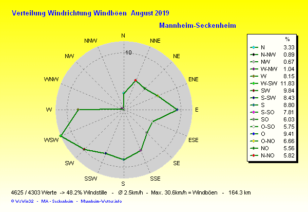 Die Durchschnittstemperatur für den Monat August 2019 lag bei 21.63°C. Die Abweichung vom langjährigen Mittel war +2.83°C.