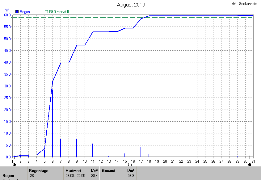 Die gesamte Regenmenge lag bei 59.8l/m² (entspricht: 101.4%) und war damit um +0.8l/m² vom langjährigen Wert entfernt. Niederschlag gab es an 12Tagen. Mehr als 2mm Regen gab es an 6Tagen. Sehr viel Regen mit mehr als 20mm pro Tag gab es an 1Tagen.