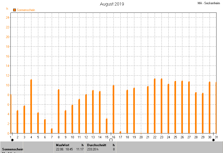 Dargestellt wird die grafische Übersicht für die Sonnenscheinzeit. Zu sehen sind immer die täglichen Sonnenstunden (von 0-24 Uhr):
