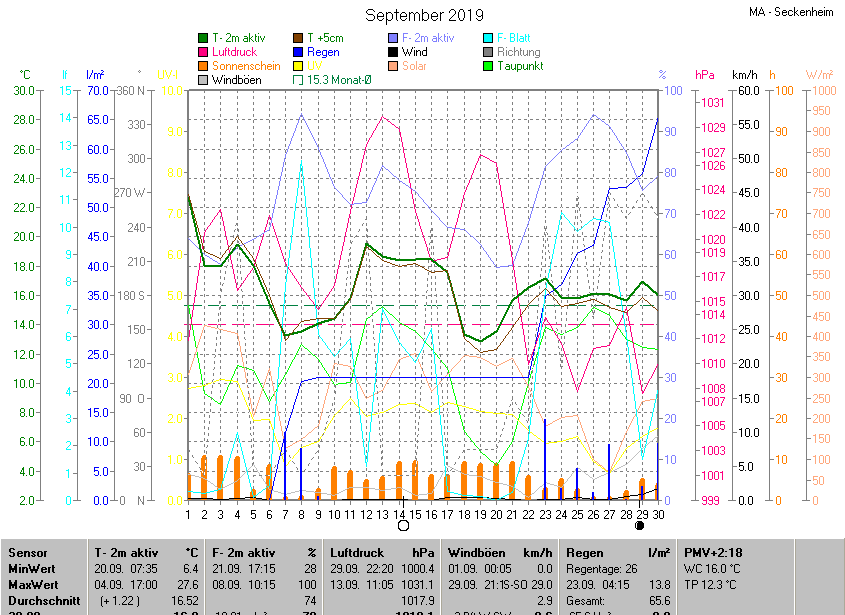 Die Durchschnittstemperatur für den Monat September 2019 lag bei 16.52°C. Die Abweichung vom langjährigen Mittel war +1.22°C.