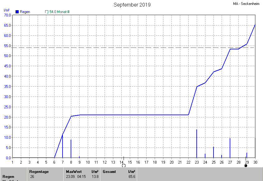 Die gesamte Regenmenge lag bei 65.6l/m² (entspricht: 121.5%) und war damit um +11.6l/m² vom langjährigen Wert entfernt. Niederschlag gab es an 11Tagen. Mehr als 2mm Regen gab es an 8Tagen. Sehr viel Regen mit mehr als 20mm pro Tag gab es an 0Tagen.