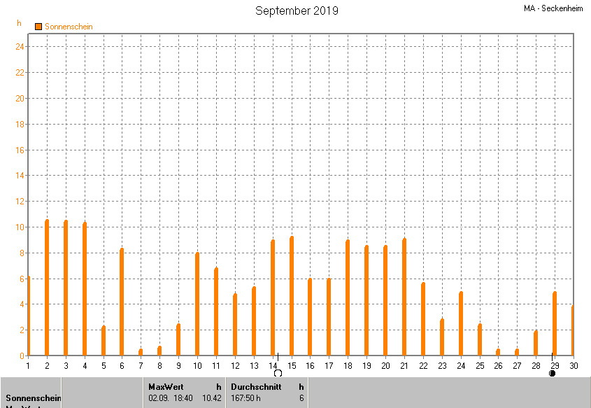 Dargestellt wird die grafische Übersicht für die Sonnenscheinzeit. Zu sehen sind immer die täglichen Sonnenstunden (von 0-24 Uhr):