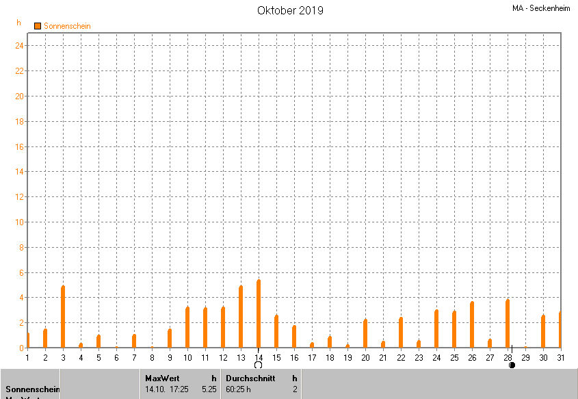 Dargestellt wird die grafische Übersicht für die Sonnenscheinzeit. Zu sehen sind immer die täglichen Sonnenstunden (von 0-24 Uhr):
