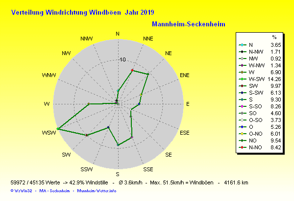 Die gesamte Regenmenge lag bei 615.0l/m² ( 91.9%) und war damit um -54.0l/m² vom langjährigen Wert entfernt. Niederschlag gab es an 179Tagen. Mehr als 2mm Regen gab es an 84Tagen. Sehr viel Regen mit mehr als 20mm pro Tag gab es an 4Tagen.