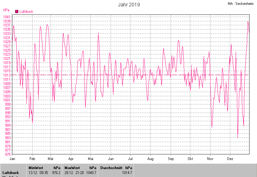 Die Durchschnittstemperatur für das Jahr 2019 lag bei 12.53°C. Die Abweichung vom langjährigen Mittel war +2.33°C.